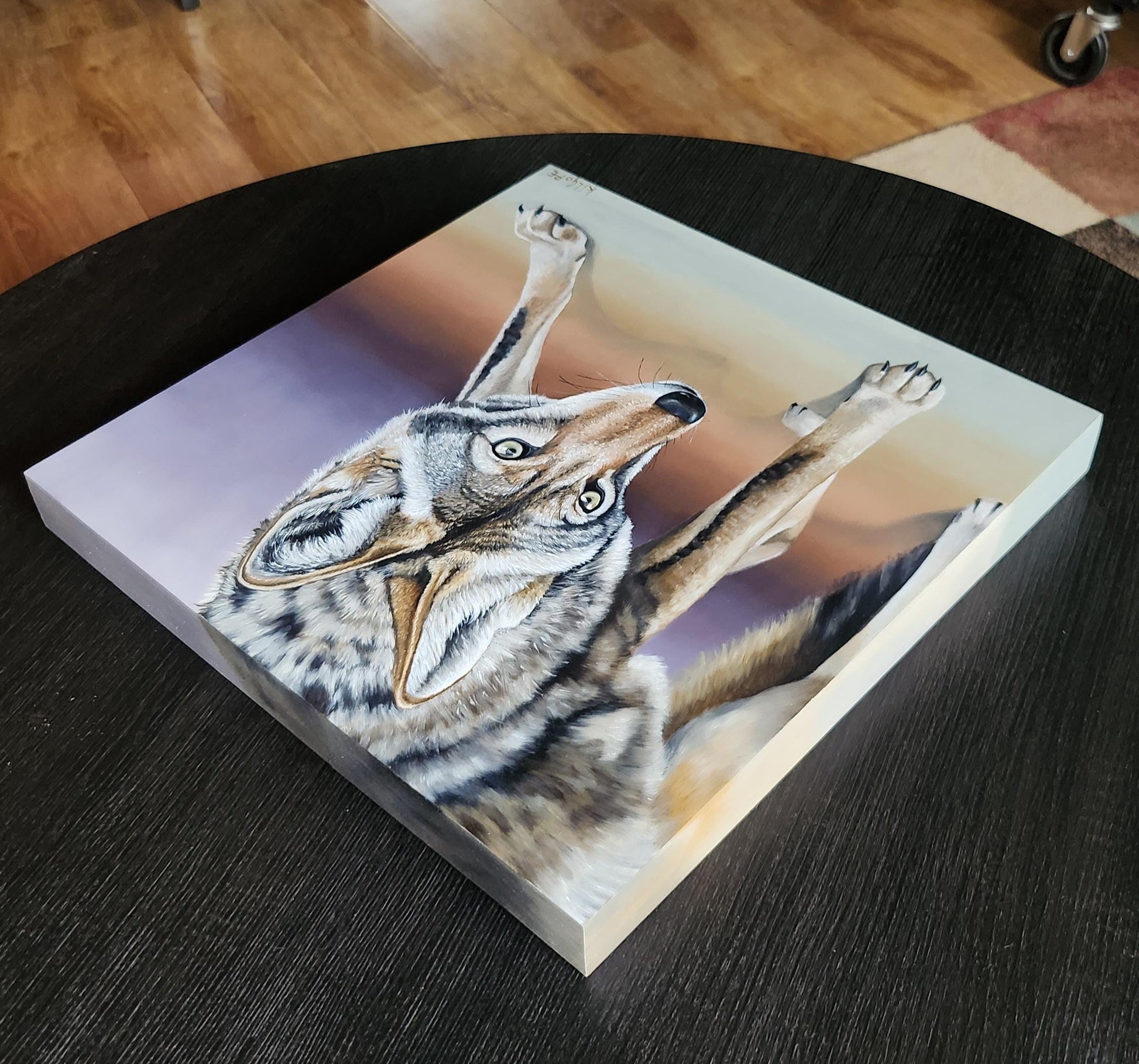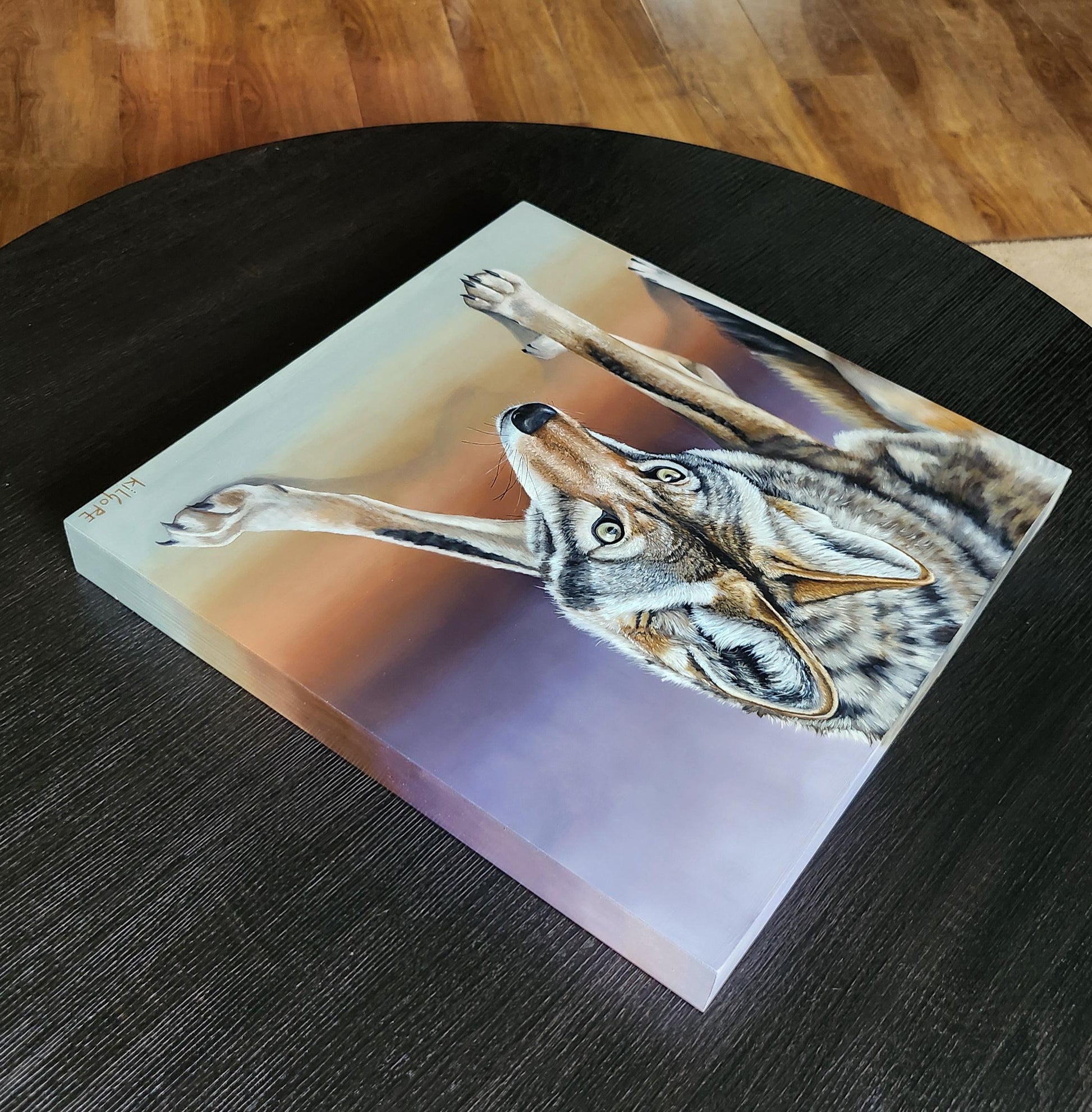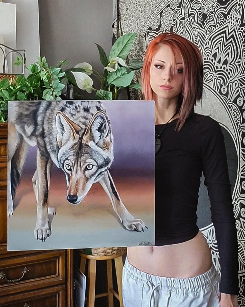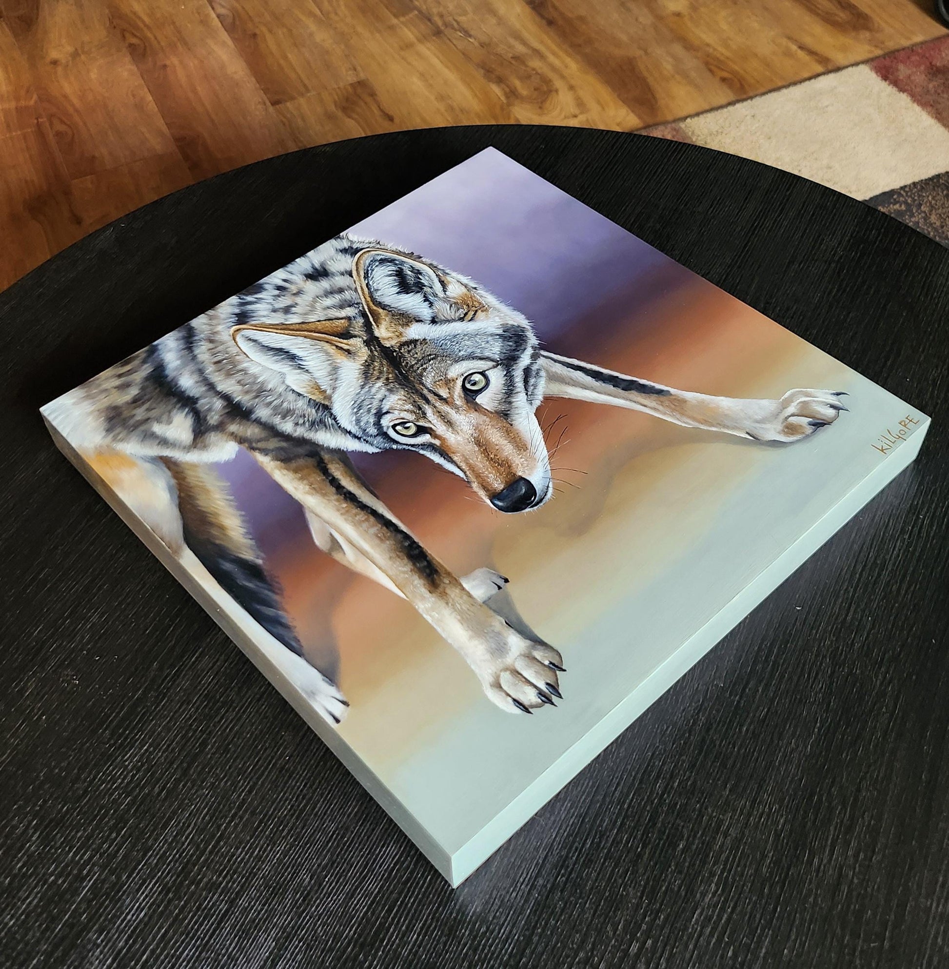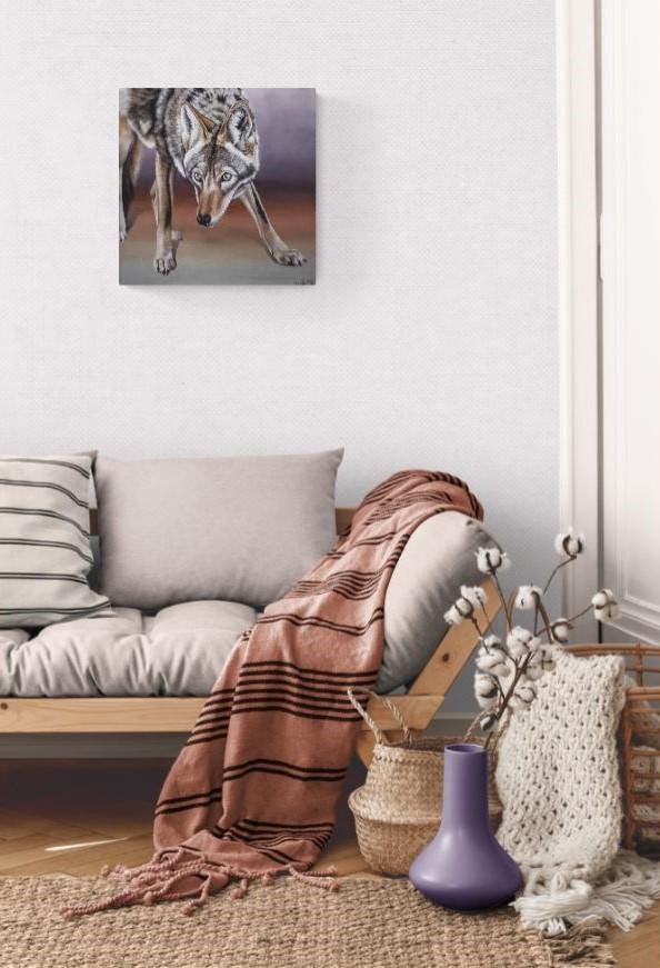 This is an original oil painting featuring a coyote with a piercing gaze. This painting comes varnished and ready to hang.