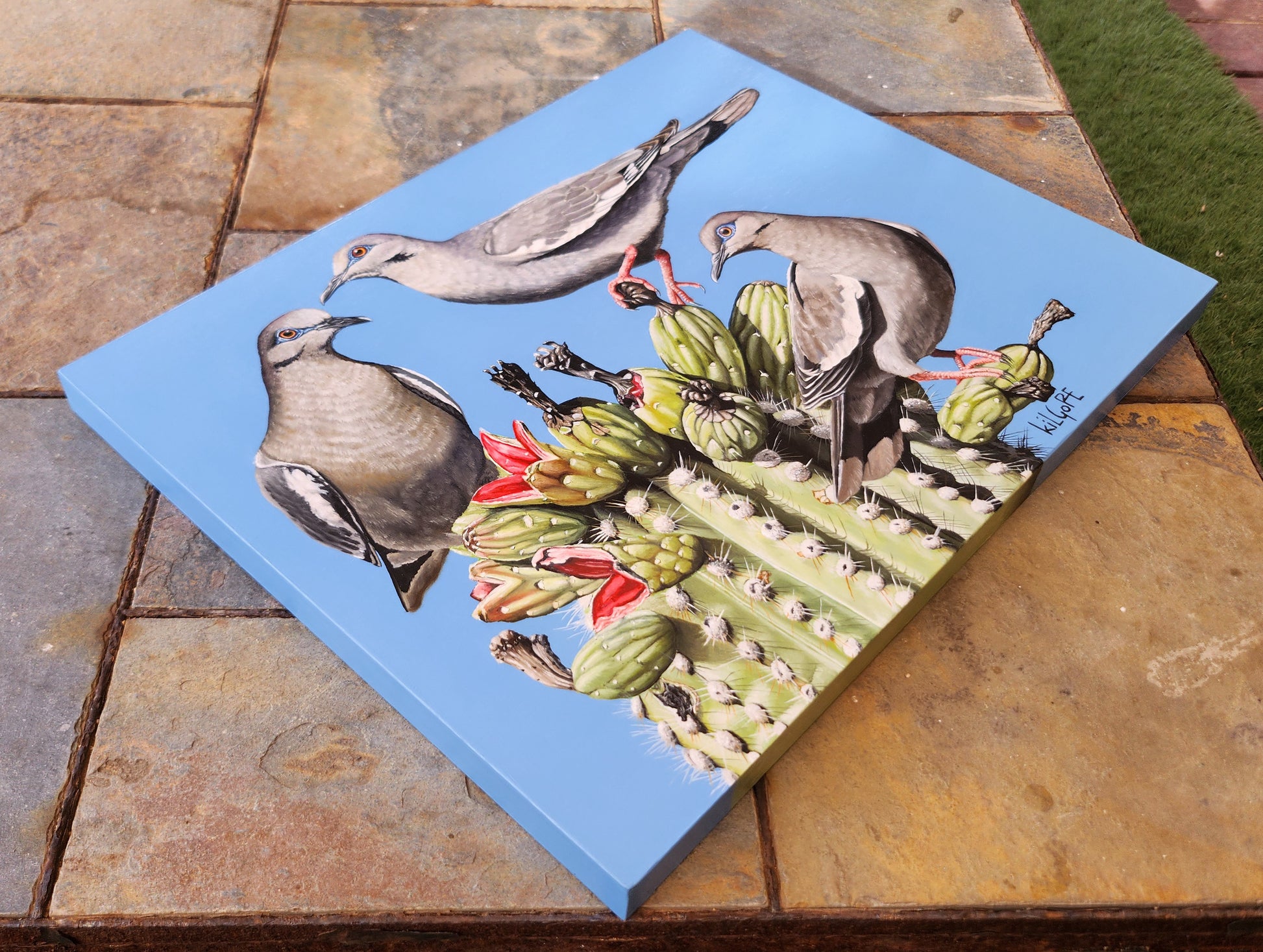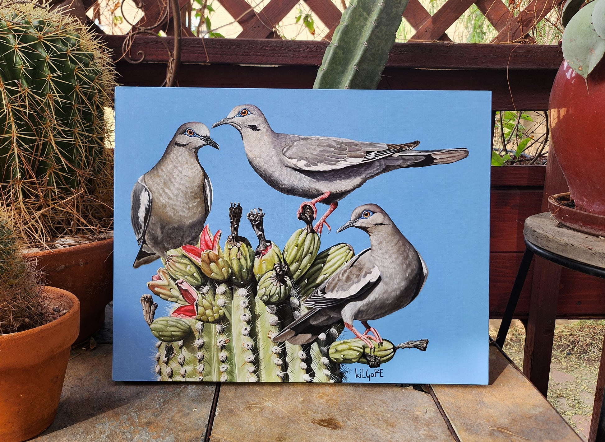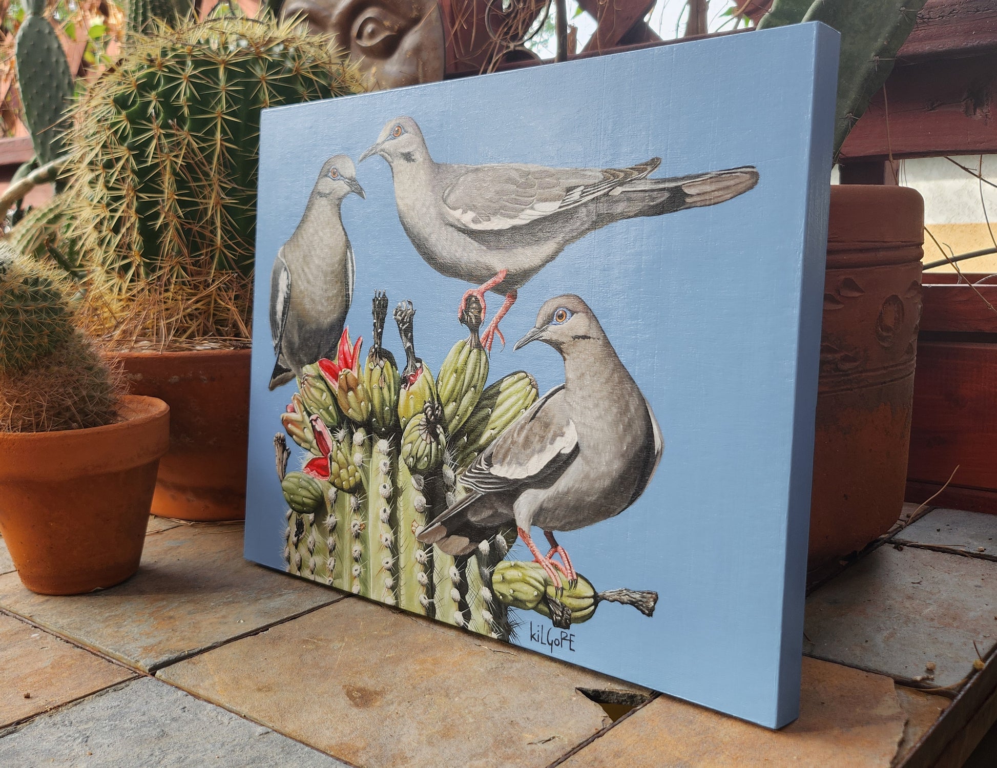 This is an original oil painting featuring 3 White-Winged Doves resting on top of a fruiting Saguaro cactus. This painting comes varnished and ready to hang.