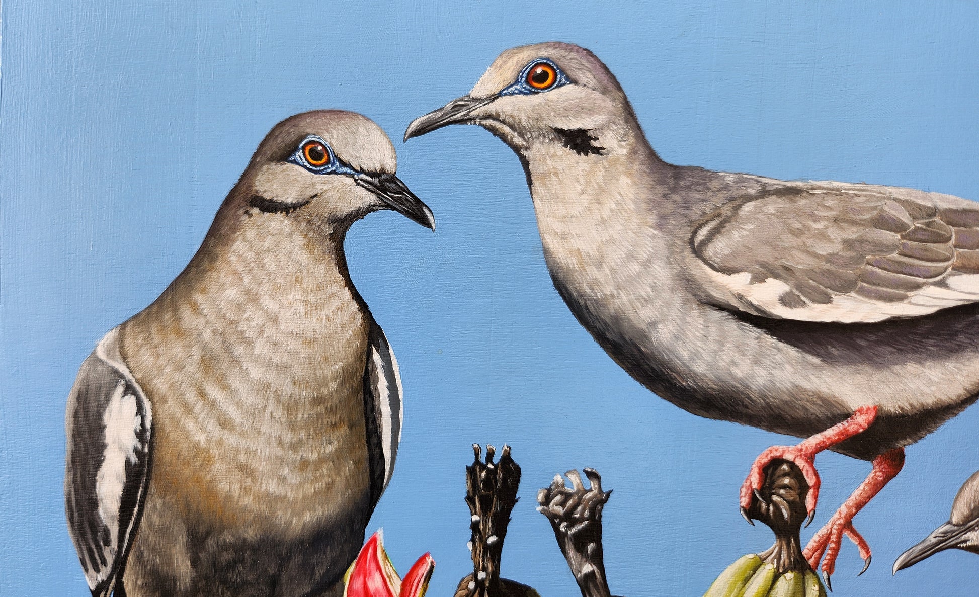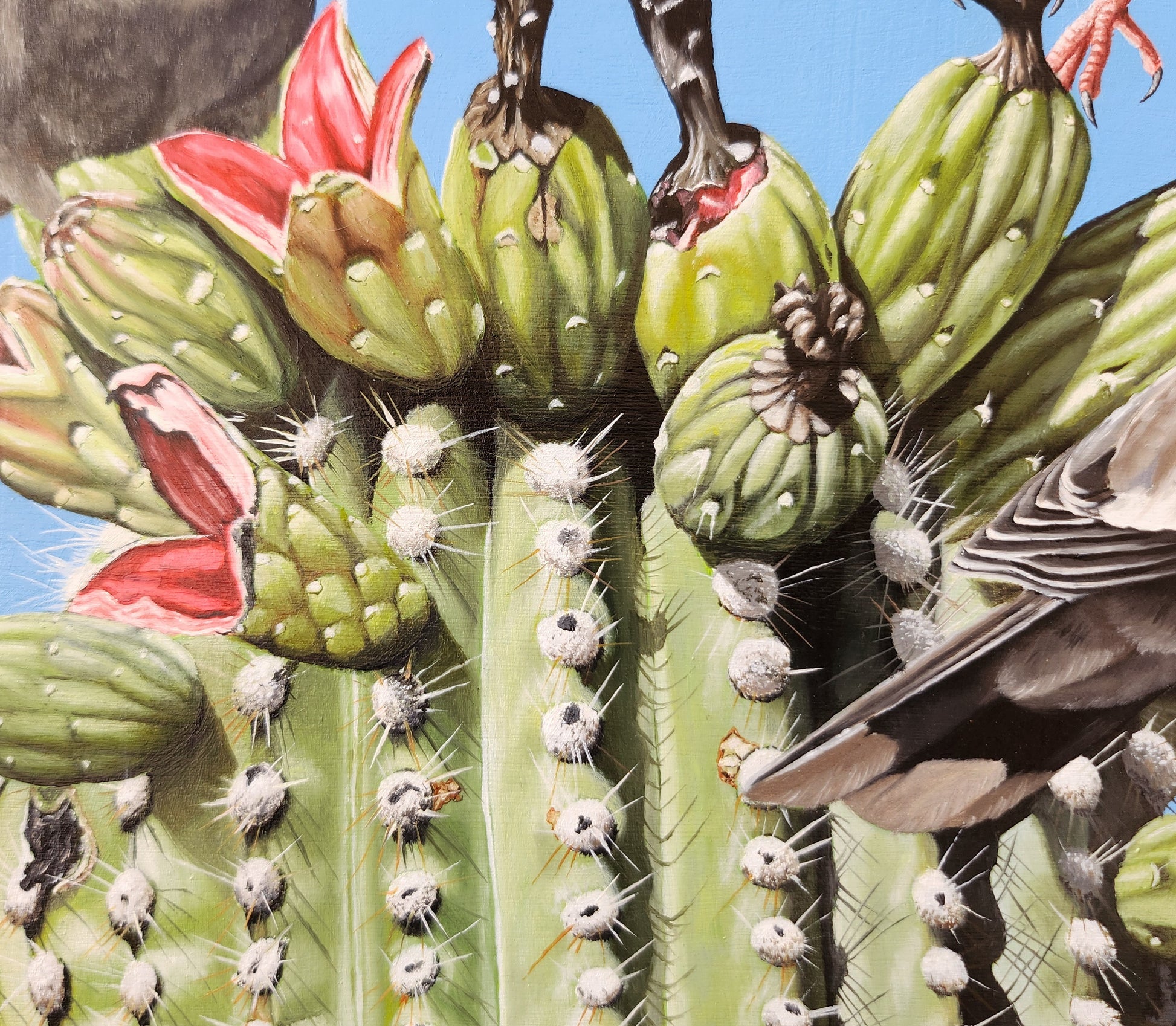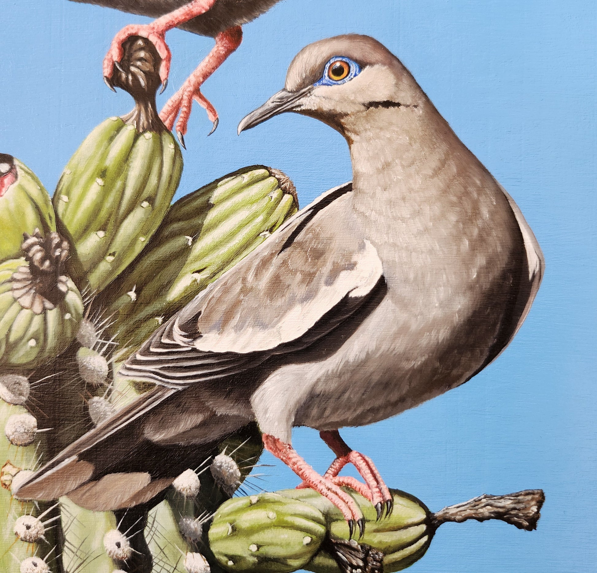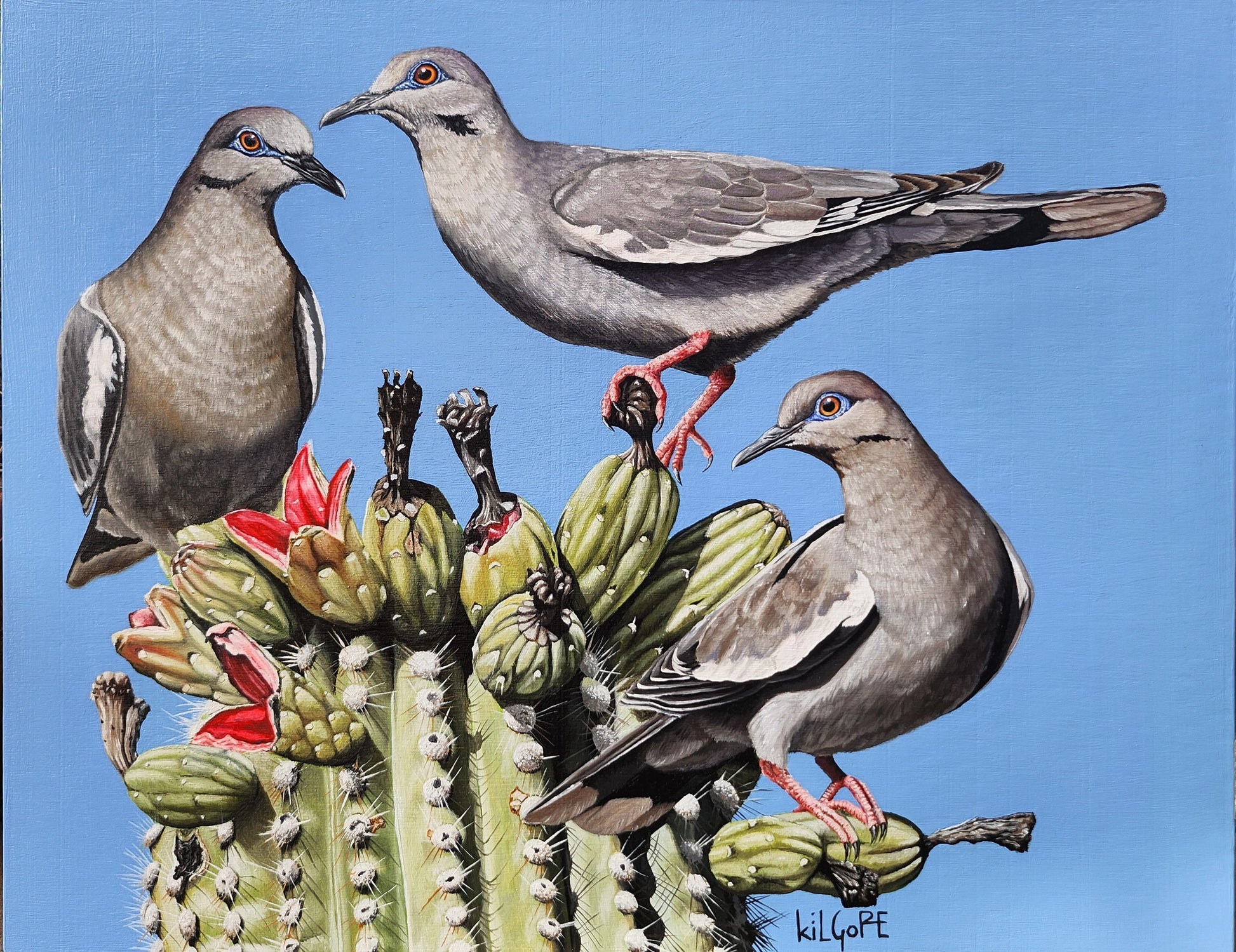 This is an original oil painting featuring 3 White-Winged Doves resting on top of a fruiting Saguaro cactus. This painting comes varnished and ready to hang.