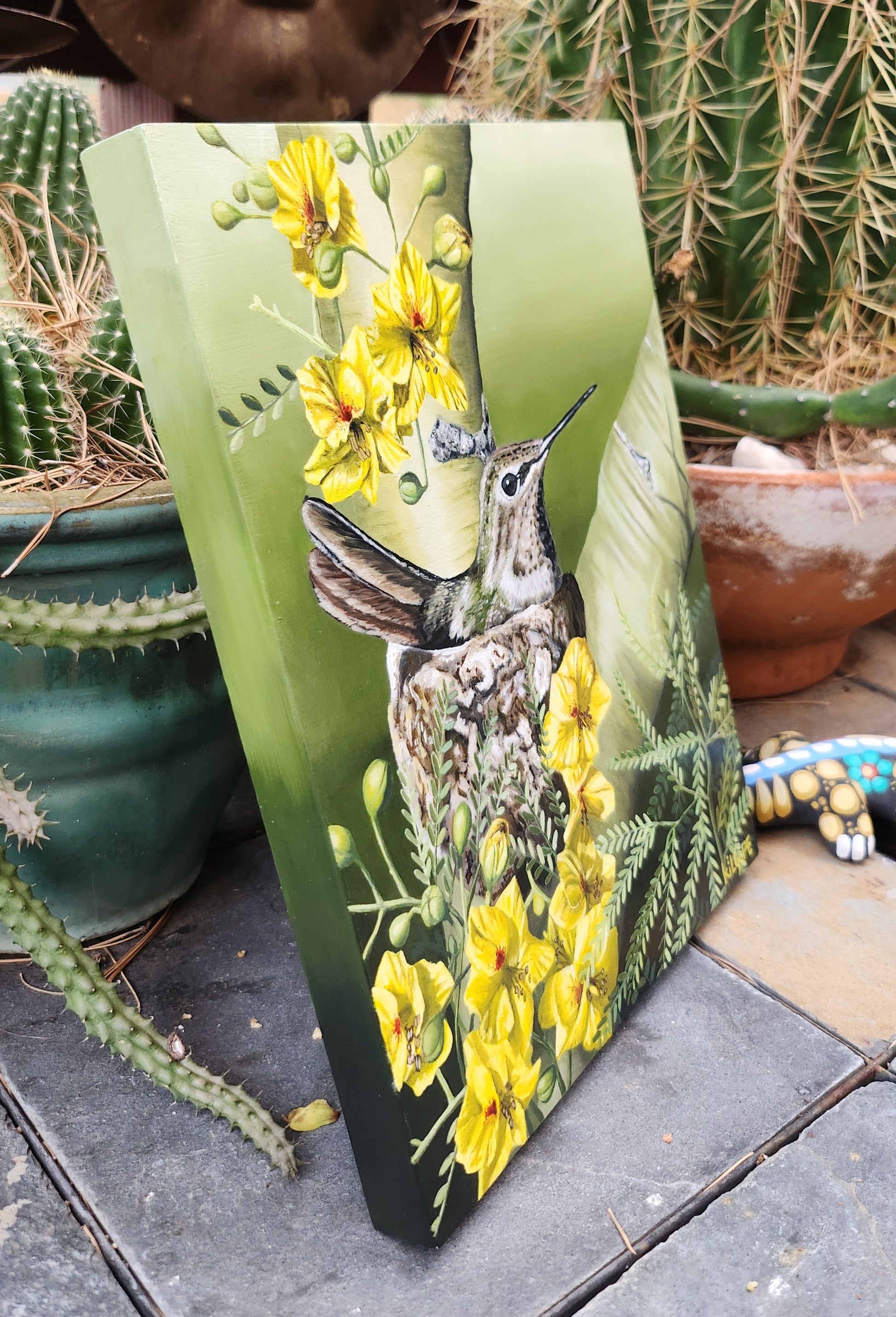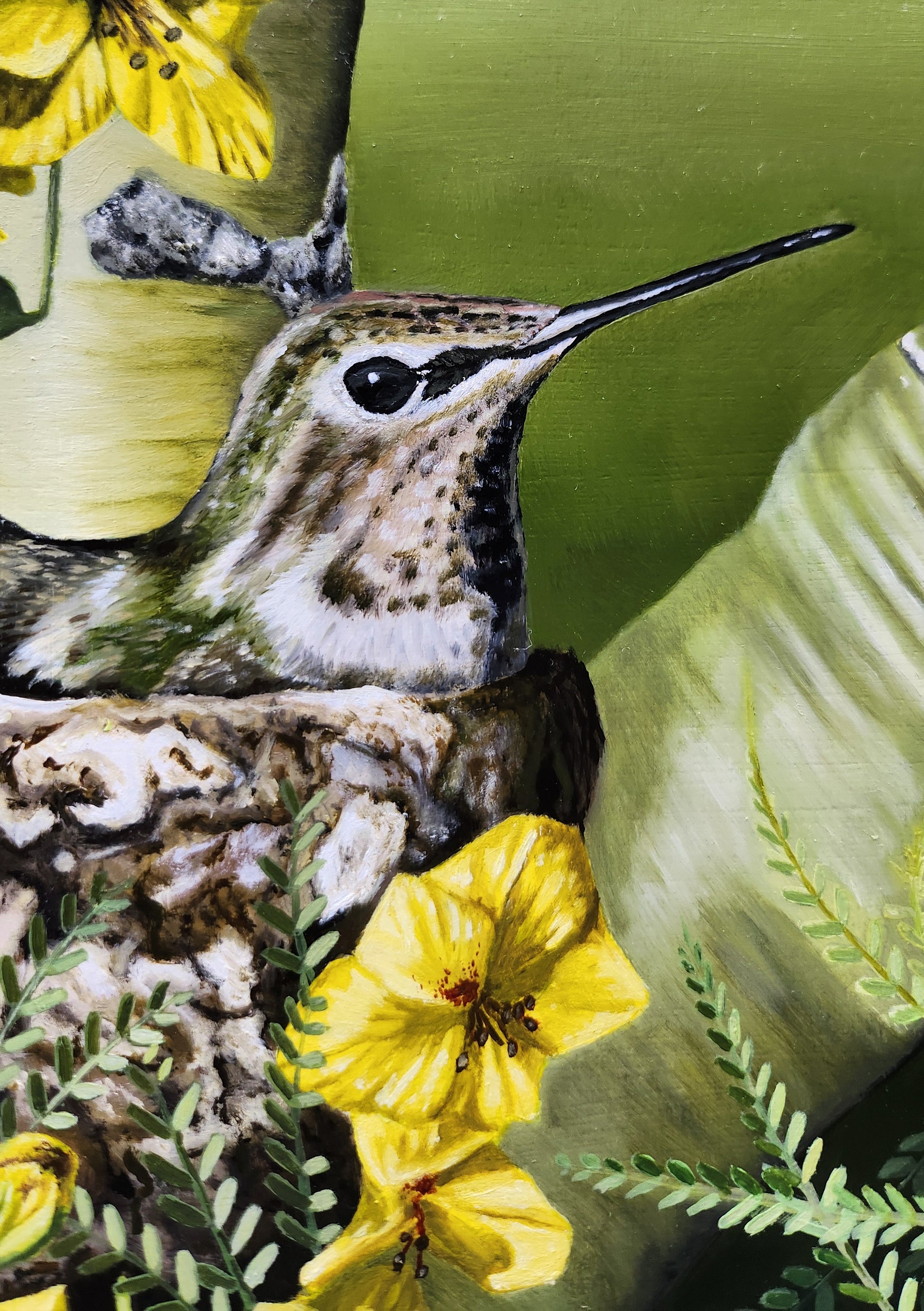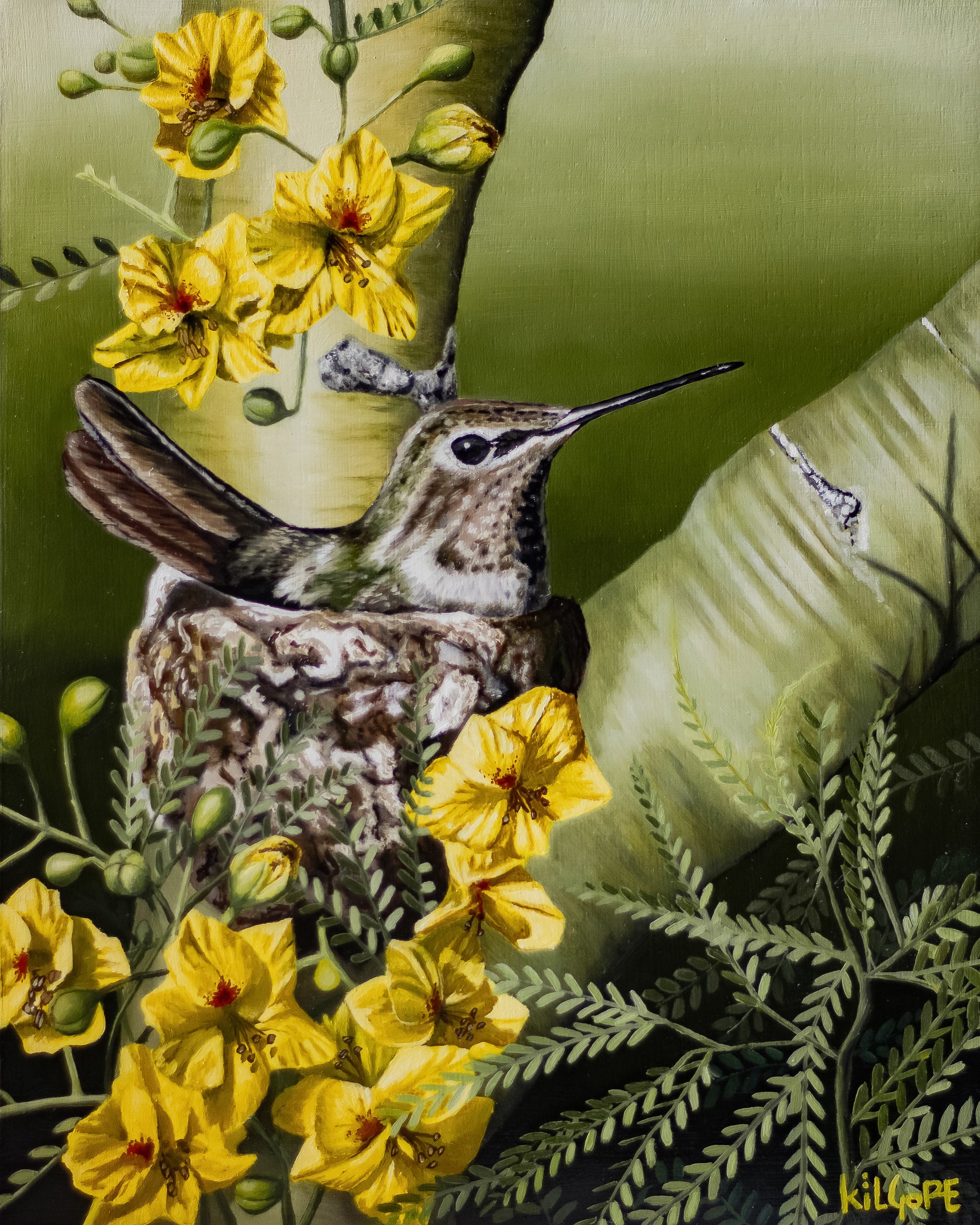 This is an original oil painting featuring a hummingbird nesting in a blooming Palo Verde tree. This painting comes varnished and ready to hang.