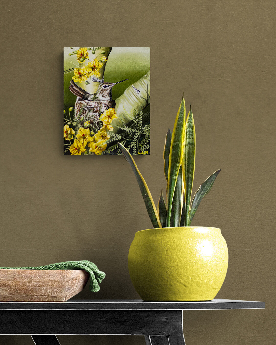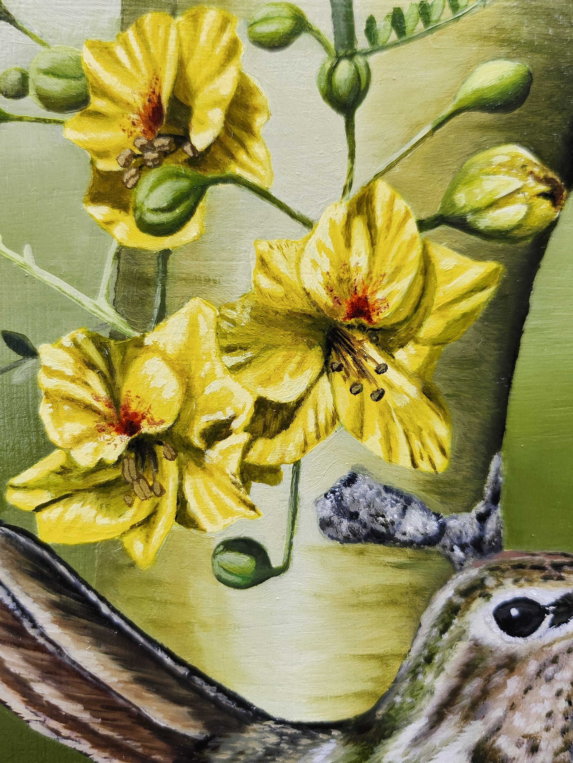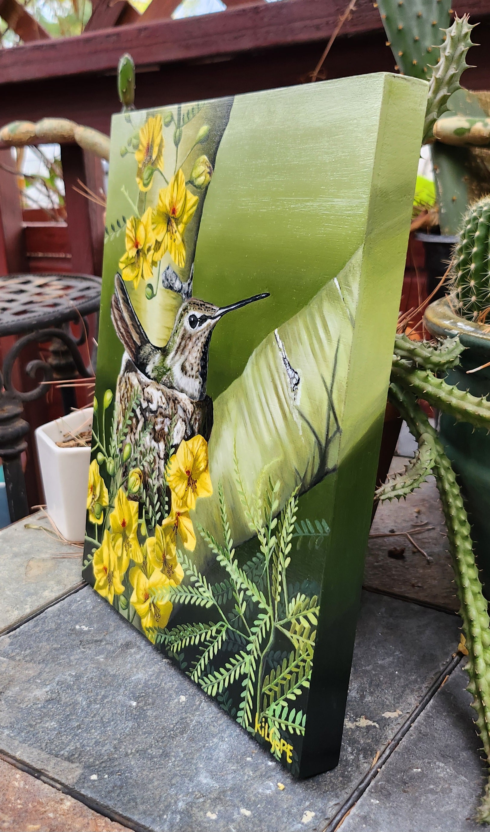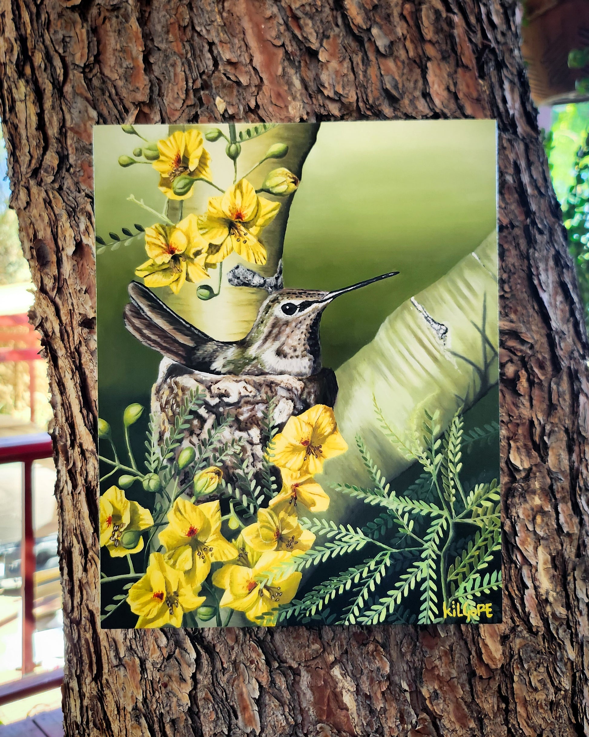 This is an original oil painting featuring a hummingbird nesting in a blooming Palo Verde tree. This painting comes varnished and ready to hang.